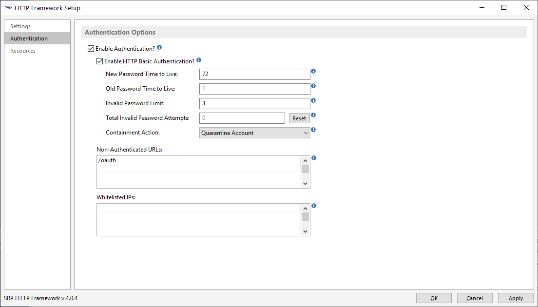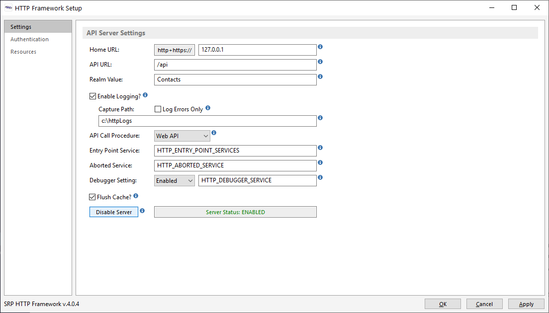 - Enable Logging? and Capture Path - These settings tell the SRP HTTP Framework whether logging should be enabled and where the log files should be stored. It is good practice to keep logging enabled. Change the path to any suitable location.