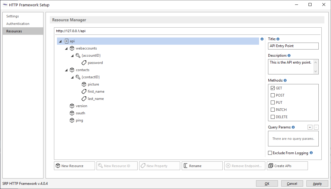 All valid endpoints are defined on this page through the creation of new resources, resource IDs, or resource properties. If this is a new project then leave this page alone until you have confirmed that the SRP HTTP Framework is properly installed and responding to API requests.